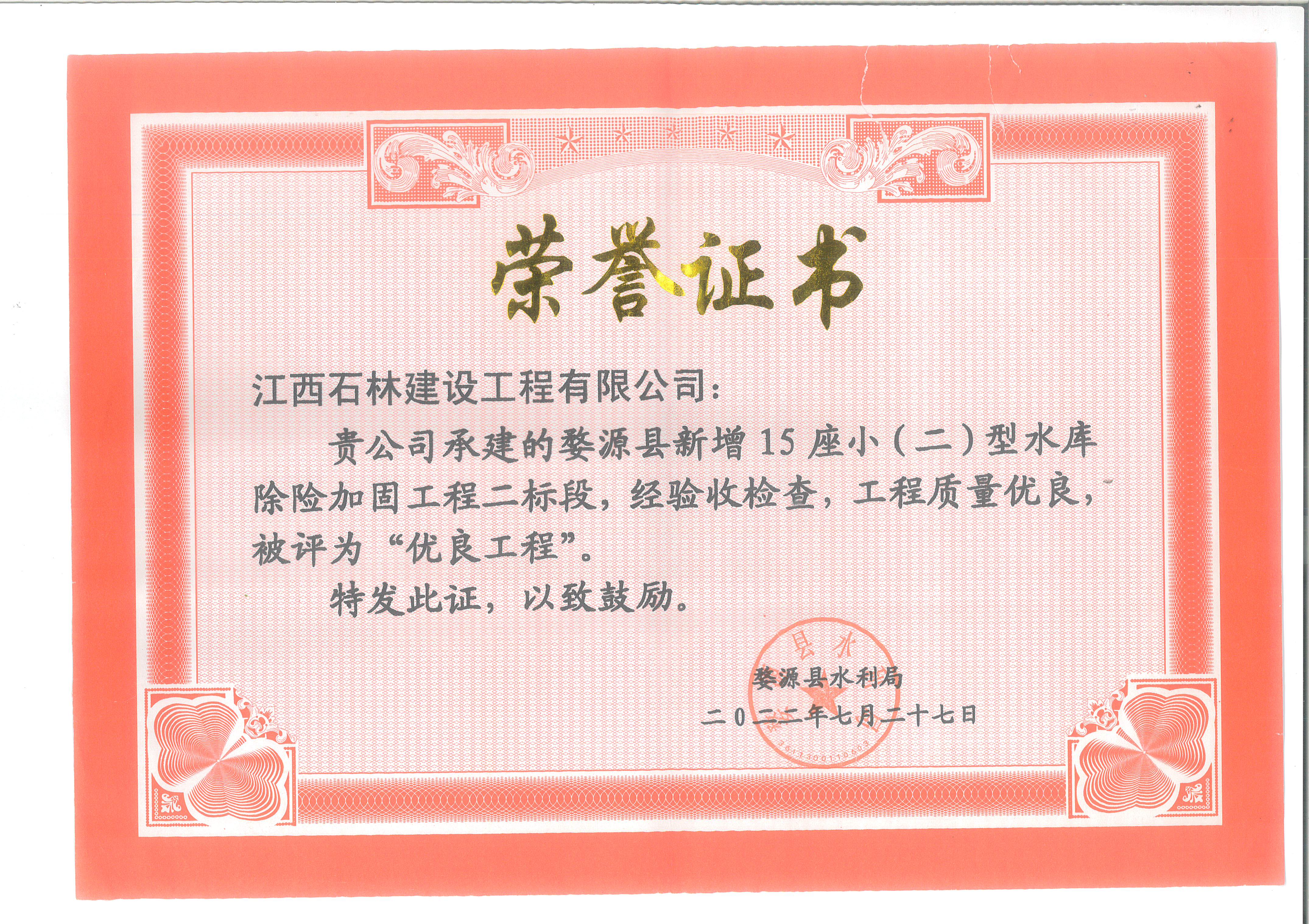 婺源县新增15座小(二)型水库除险加固工程施工二标段优良工程